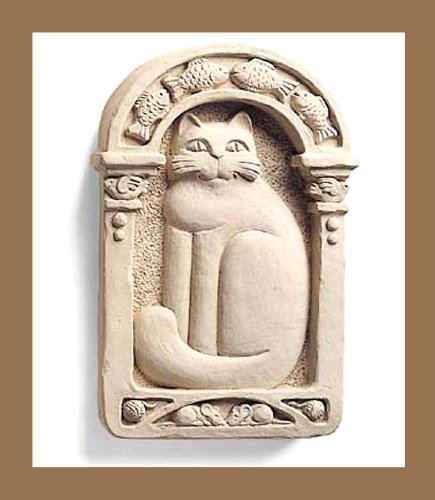 This is our very first plaque. It remains a best seller due to its simplicity and charm. The sculpted cat image is bold yet elegant. Notice the fish, mice, balls of yarn, and birds that help make the border. A gift for every cat lover. People sometimes write to us and describe how well this statue works as a pet memorial.